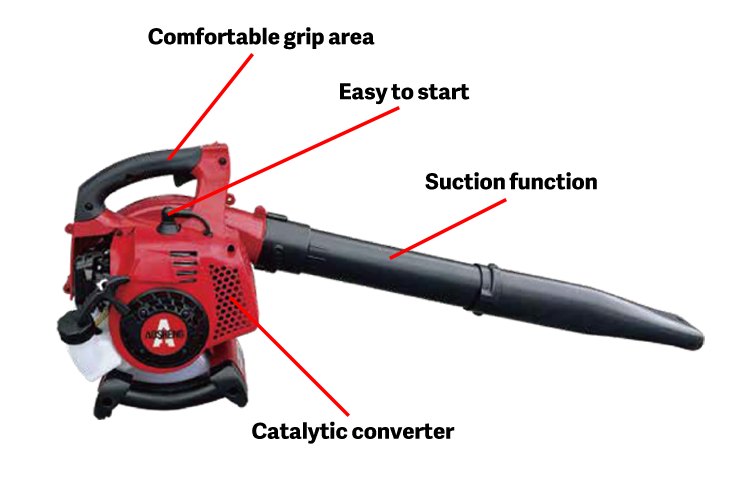 Aspiration et soufflage Certification Euro 5 Poignée recouverte de caoutchouc, collecteur en nylon résistant.